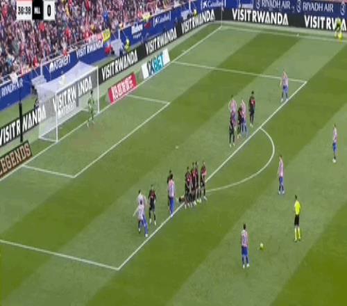 第36分钟,阿尔瓦雷斯禁区前任意球直接攻门,被人墙挡出