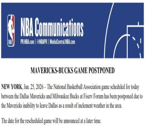 今天,NBA官方宣布, 独行侠对阵雄鹿,掘金对阵灰熊,因当地恶劣天气,比赛取消延期。