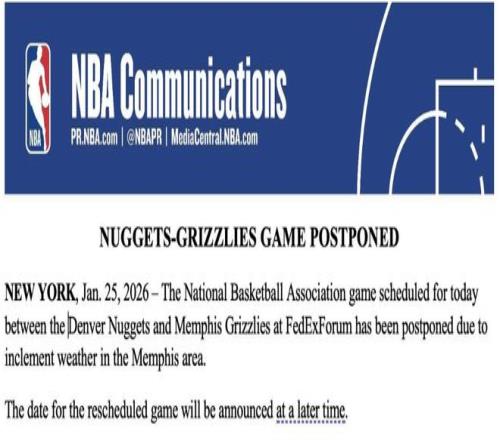掘金对灰熊比赛,是因为孟菲斯地区遭遇冻雨和雨夹雪极端天气,导致电线结冰引发大规模停电、道路封闭。